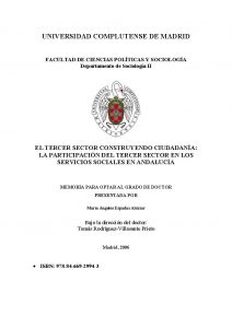 Esta tesis se centra en uno de los focos de interés de las recientes investigaciones sociológicas sobre el Bienestar, esto es, las relaciones Estado-Ciudadanos en la reestructuración del modelo Estado de Bienestar. En ese contexto el Tercer Sector se prefigura en la actualidad como una esfera fundamental, aunque también controvertida, especialmente en lo que se refiere sus potencialidades como cauce de participación de los ciudadanos.